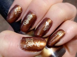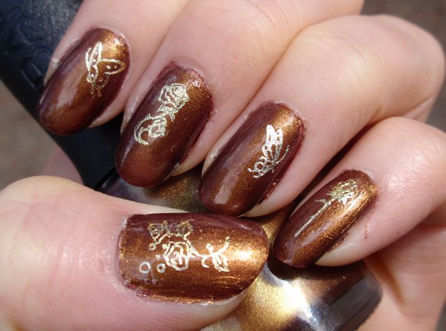 Jag tycker att det ser fint ut med det bruna när det blänker i det. Själv är jag svartnaglad, har ju varit på hårdrocksfestival. Men var hittar du alla snygga ”bluppar” och mönster som du har på? Jag målar för hand, men det blir ju ganska inskränkt, eftersom jag inte är så konstnärlig, speciellt inte när jag måste måla med vänsterhanden…