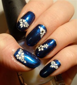 Efter en period av mer urcyklade manikyrer (som ju kulminerade i snorgrönt) är jag sugen på stilrena varianter i lite mer dämpade färger. Den här gillade jag skarpt, även om den varken är superorginell eller särskilt avancerad. Det började med Orly Star of Bombay, men den är så väldigt mörkblå och jag är inte så förtjust i nästansvarta lack, så jag piffade upp den med effektlacket Ice Blue Shimmer från CND. Det blev väldigt trevligt, ett nästan sammetsartat blått skimmer mot den mörka bakgrunden. Jag tyckte det blev så snyggt i sig att jag inte ville fiffa för mycket, så det blev bara lite enkla vita blomklistermärken på det. F ö var båda lacken mycket trevliga att lacka med och Star of Bombay täckte nästan helt på ett lager. (Det blev två lager till slut för att få det helt jämnt.)