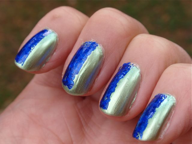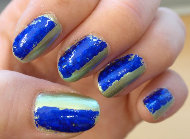 Ännu en besvikelse från Del Sol. Island Fever heter lacket, och det ska skifta från ljusgrönt inomhus till blått utomhus, men jag såg inte minsta tillstymmelse till skiftning. Nu var det visserligen ganska mulet ute när jag hade det, men ändå. Dessutom var formulan inget vidare. Det var väldigt tunt, täckte dåligt (jag tappade räkningen, men det krävdes 4-5 lager) och visar penseldragen väldigt väl. Dessutom bubblade det sig ganska lätt (kanske för att det krävdes så många lager att jag inte orkade vänta emellan). Ick! Jag gillade inte färgen så värst heller, den är för kall och frostig i min smak. På det blev det ett misslyckat försök till folie, som liksom inte satt fast på lacket under utan blev skavt och eländigt på några timmar. Miserabelt, helt enkelt, och den här manikyren överlevde bara ett dygn…