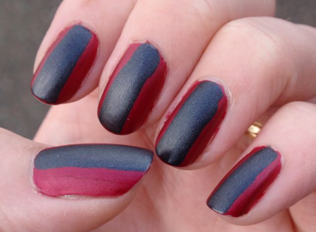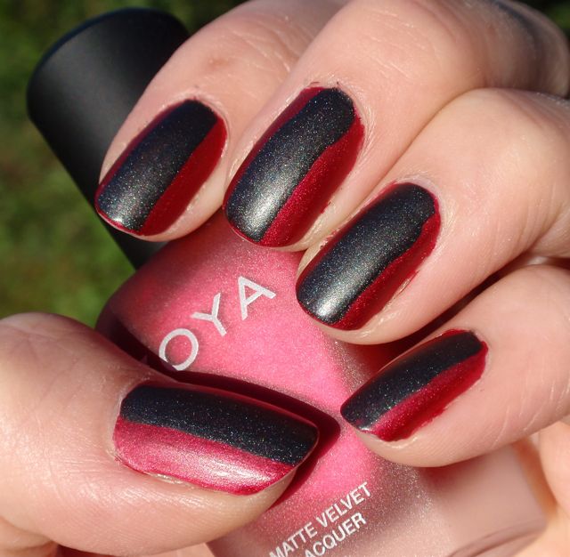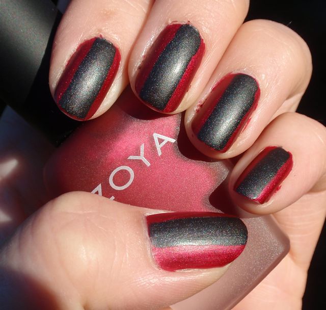 Jag hade egentligen inte tid att lacka om, men eftersom jag led så mycket av hur Del Sol Island Fever såg ut så blev det nytt ändå, men en snabb variant. Jag har inte haft mina matta lack så mycket, men de torkar ju fort så det blev två av Zoyas matta lack; röda Posh i botten med en rand av svarta Dovima. Jag gillar verkligen båda, de har ett snyggt skimmer som ger färgen djup. Dessutom är de bra pigmenterade och torkar lagom fort så man kan få till en snygg yta. (En del matta lack torkar ju så fort så man inte hinner få till det snyggt.) Jag gillar också känslan av matt nagellack, det känns lite mer olackat eftersom det inte är så slätt. Det har också hållit bra för att vara matt lack, nu är jag inne på dag 2 och det är bara en aning slitet längst ut på kanten.