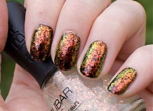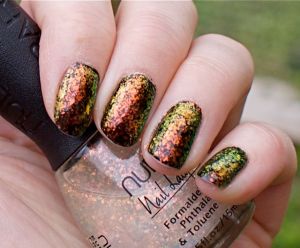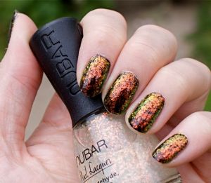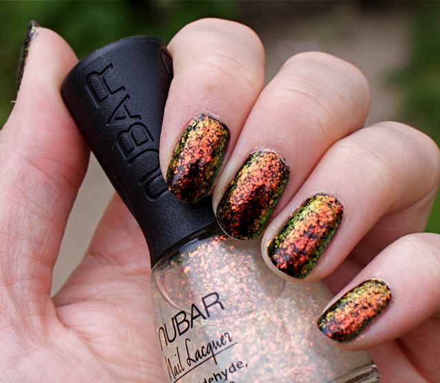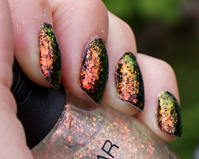 Ännu mer bilder på Nubar 2010. Det är ett så sjukt snyggt lack att det förtjänar att visas över olika färger. Här testade jag det över ett svart krämlack, Orly Liquid Vinyl. Det skiftar i grönt, guld och orange och är jätteläckert! Tyvärr överlevde det inte Sonispherefestivalens kompakta blöta, så jag hann inte få så bra bilder. Ni får ursäkta att de är lite suddiga (och att mina nagelband inte hämtat sig från fjällvandringen än).