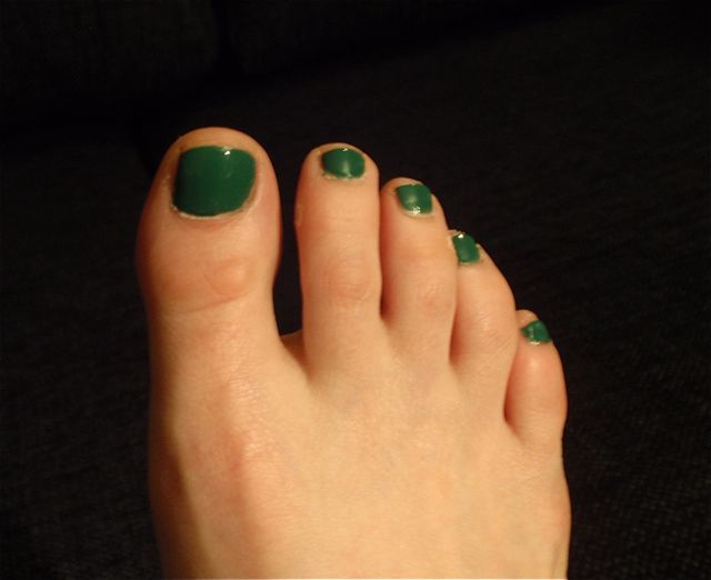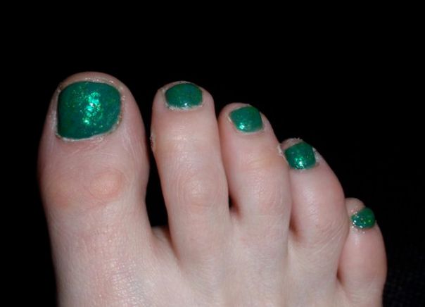 Jag fortsätter med Nfu Oh flakies, men har slut på fingernaglar för tillfället, så det fick bli till att använda tårna. Nummer 40 är blågröna flakes i en genomskinlig bas. Det är samma typ av lack som Nubar 2010 men med annan färg på flakesen (så jag kan intala mig själv att jag behöver båda). Jag har det över det jadegröna krämlacket Jade is the New Black från OPIs Hong Kongkollektion. Jag har inte visat Jade is the New Black tidigare, så jag tog en bild innan jag lade på Nfu Oh 40. Det har en trevlig formula och täckte helt på två lager.