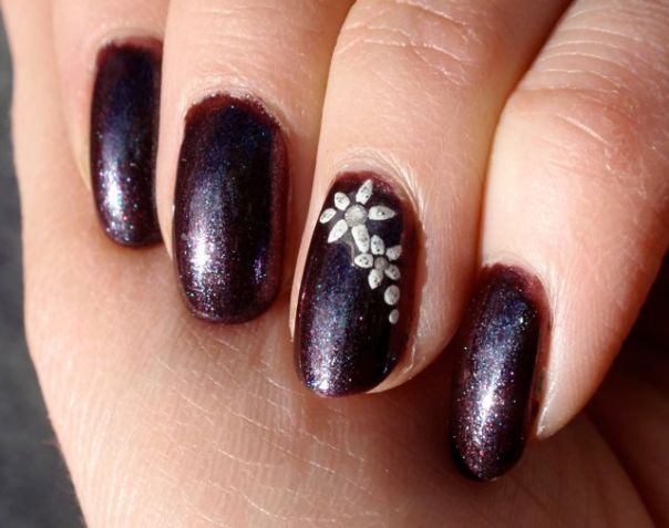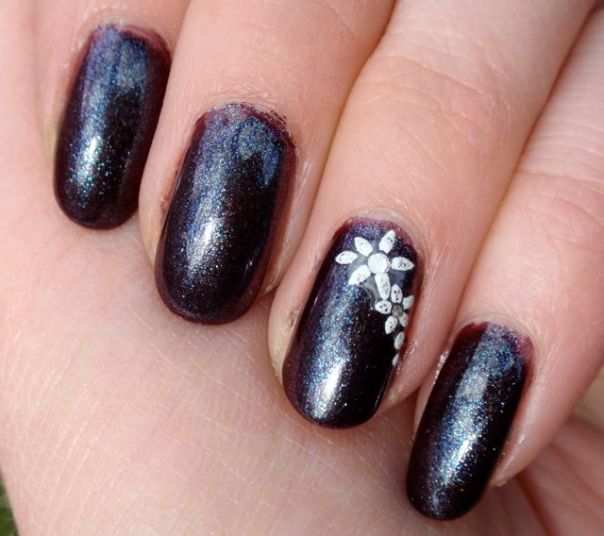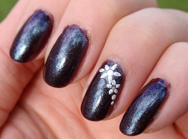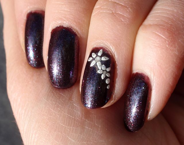 Ännu ett sjukt snyggt lack från Orly Cosmic FX-kollektionen (som f ö finns att köpa från Nailmail den här månaden). Färgen på Galaxy Girl är lite svårbestämd. Det är mörkt vinrött i botten med duokromt glitter i vinrött och blågrönt. Ett unikt och jätteläckert lack! Jag är lite kär i det… Det blev några små klistermärken på det också för att bryta av lite (och för att jag är lite dekorationssugen). Tre lager täckte finfint och det var bra att applicera. Även detta hade bra torktid. Svårt att fota inomhus däremot, men nu hade jag turen att faktiskt vara utomhus och ha med mig kameran idag när det var lite sol och då gick det att få till hyfsade bilder.