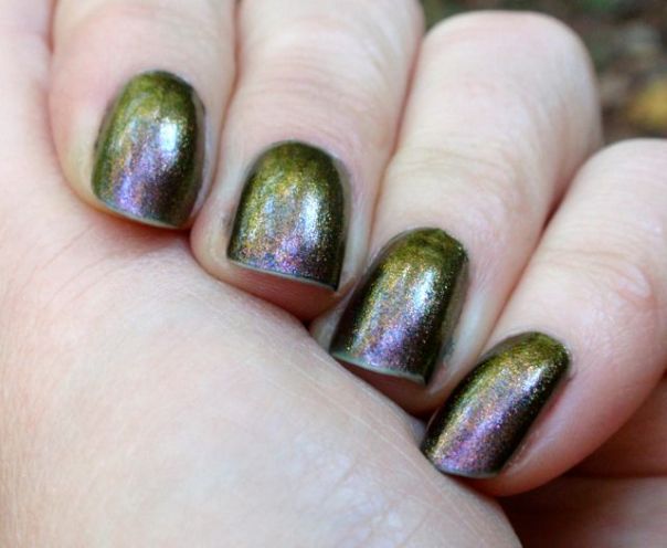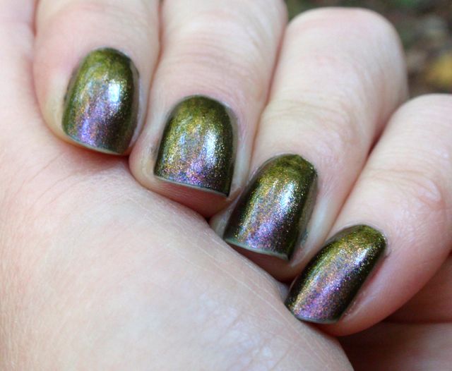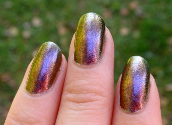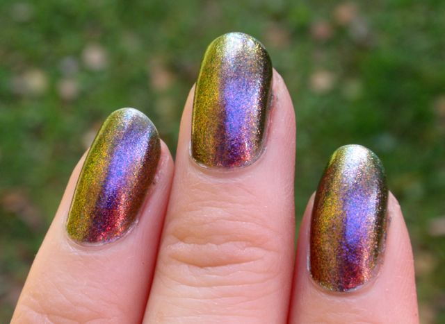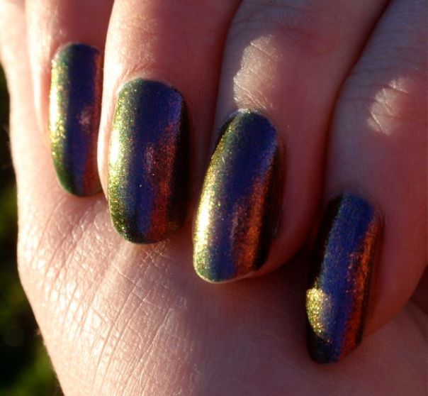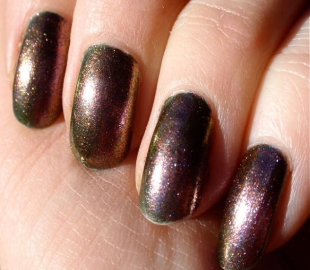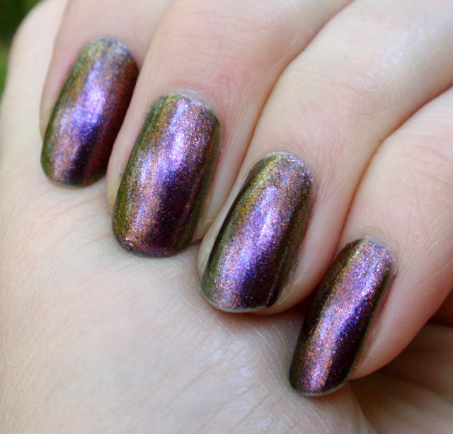 Ytterligare ett lack från Cosmic FX-kollektionen, och det här är nog det mest hypade av dem alla. Med rätta – det är verkligen ett spektakulärt lack! Det skiftar mellan lila, rosa, grönt och guld i både ljusa och mörka nyanser och har ett otroligt djup i färgen. Mycket svårt att beskriva, och extremt svårt att fota. Jag har tagit 30-40 bilder i olika ljus och vinklar och tycker inte att någon av bilderna visar hur det egentligen ser ut. Det huvudsakliga intrycket är det rosalila skimret med en maffig duokrom effekt i grönguldigt. I vissa ljus blir det däremot nästan helt guldigt och i andra mörklila med mångfärgat glitter i det. Helt fascinerande.Det blir lite bildspam för att försöka visa några av dess olika skepnader: