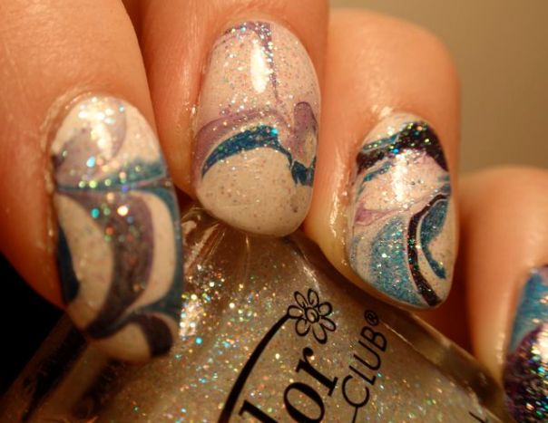 Mina marmorerade naglar håller fortfarande bra, men jag ville piffa upp dem lite, så jag la på ett lager Color Club Si Vous Please! Det är ett fint överlack med smått holografiskt glitter. Jag tycker det blev rätt bra, klart piffigare. (Senare tillägg: Fast lite Hello Kitty-varning blev det allt vid närmare eftertanke… 😉 Det påminner mig om de glittriga gummistudsbollarna jag hade när jag var liten.) Det är ett jättefint överlack i alla fall, det glittrar galet mycket. Jag lägger upp några delvis suddiga bilder, så glittret ska synas bättre…