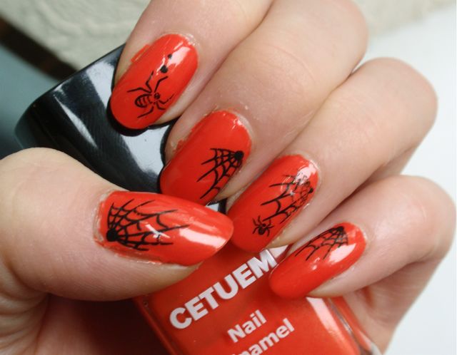 Mina naglar blev lite mer sansade än Lottas (fast kanske en aning knasiga ändå), jag har det knallorangea Cetuem 48 med vattendekaler från eBay (säljare är aline288). Jag gillar resultatet, det är definitivt halloweenigt, men snyggt ändå. Cetuem 48 var ok att hålla på med, inte världens bästa formula och det hade en tendens att dra med sig lagren under om jag fipplade för mycket med det, men helt ok. Det täckte förvånande bra för att vara så ljust, jag har tre lager av det och det var rätt ok efter två, bara en aning ojämnt.