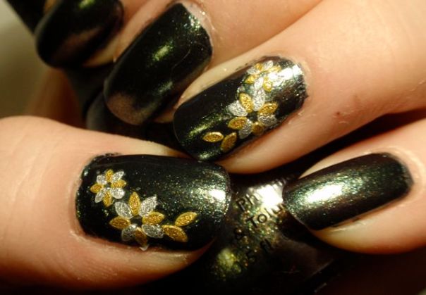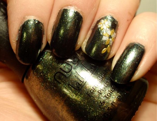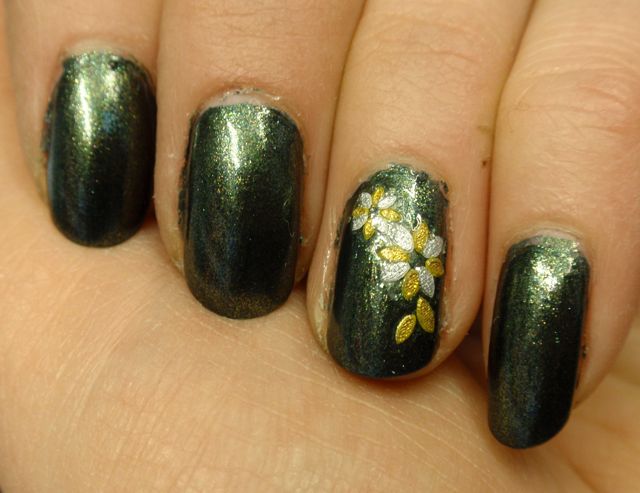 Nubar Verde kommer från Venetian Glass-kollektionen och är ett riktigt fint lack! Det ska tydligen vara extremt likt Zoya Edyta, men eftersom jag inte har det senare så spelar det ingen roll. (Jag lyckades dock hålla mig ifrån att köpa båda, även om det var nära ett tag… :-)) Det har en ganska kall mörkt grön färg med skimmer i guld – och kanske lite silver också, det är svårt att se riktigt varifrån den kalla tonen kommer. Kanske är det lite blått skimmer också? Det var trevligt att lacka med och täckte på två lager. Dekalerna är från eBay och köpta i storpack från en säljare som jag sedan länge glömt bort. Fina är de i alla fall. Jag har som sagt lite knapert med tid till manikyr numera, så då är fina dekaler och annat snabbt bling en räddare i nöden.