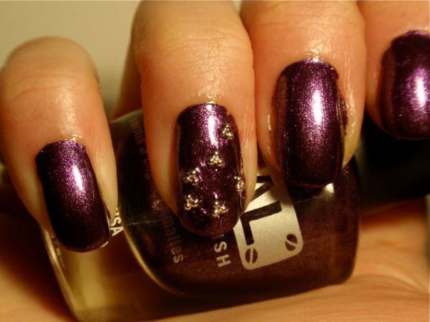Ännu ett L.A. Girl Metal-lack! Nu har turen kommit till det lila Millennium. På bilderna blev det lite för rosatonat, det är egentligen blålila. Formulan var underbar! Lättkontrollerad och täckte finfint på två lager. Lystern är jättefin också, riktigt metallisk och med ett fint djup. Jag har bara bra saker att säga om lacket. Dekoren är små silverkulor som jag köpt på eBay, som trycktes ner i lacket innan det torkade och förseglades med två lager Seche Vite. Det blev helt ok, faktiskt. Lite lyckades jag kladda till det här och var eftersom den här manikyren gjordes mitt i natten i all hast, men jag är rätt nöjd ändå.