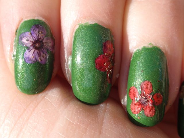 Tja, jag gillar hur som helst resultatet. Det blev somrigt, precis som jag ville! Jag ville ha en sommaräng på naglarna. Riktiga blommor är fina eftersom de är så detaljerade och lite naturligt oregelbundna.
