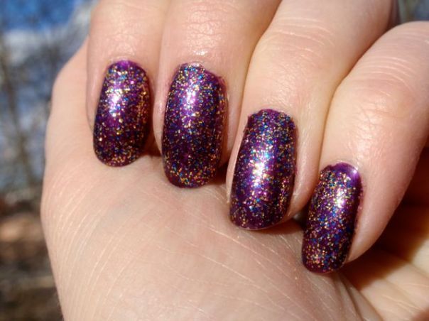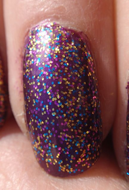 Lite glitter kan behövas ibland, det var ett tag sedan, så det blev superglittriga OPI Sparkleicious från Burlesquekollektionen. Eftersom det består av glitter i guld, blått och lilarosa tänkte jag plocka upp färgerna i glittret genom att ha det över ett lila lack. En titt i förrådet visade att jag faktiskt bara hade ett lila som slår i rosa snarare än blått så det blev ett urgammalt L’Oreal Jet-Set nr 225. Jag har haft det i säkert 10-15 år och formulan var därefter. Trots förtunning var det ojämt och jävligt att måla med. Dessutom missfärgade det mina naglar så de blev vagt lilarosa. Tjusigt… Det går i soporna! Som tur är har jag beställt Avalon från A-England med nästa Nailmailutskick, så hålet i samlingen kommer snart att fyllas.