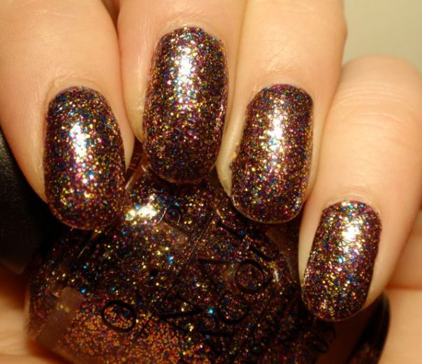 Sparkleicious var desto trevligare. Jag hör till de som gillar OPIs breda borste och det var bra att applicera. Jag hade ett lager över det lila i fyra dagar och när jag sedan ledsnade på det men inte hade tid att byta lack så la jag bara på två lager till så det täckte helt. Det var ganska knöggligt och behövde ett par-tre lager överlack för att bli hyggligt jämnt.