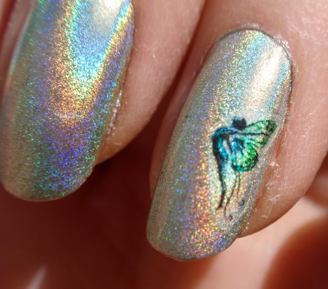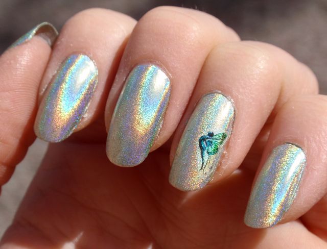 Det sägs att överlack ska förstöra holoeffekten, så jag hade bara överlack på ringfingrarna som jag hade dekorerat med en liten ursöt grön älva (köpt från rhubarbe09 på eBay). Det är jättefina och mycket billiga klistermärken hon säljer. Man får klippa ut dem från underlaget själv, men de är tunna och följsamma och enormt detaljerade. Enda nackdelen är att de syns bäst över ljusa lack, och det har jag lite begränsat med i förrådet (jag är inte så mycket för pasteller…). Hur som helst, naglarna jag inte hade överlack på chippade och förstördes på ett dygn, så oavsett om det påverkar holoeffekten eller inte så är det inte värt att skippa överlacket. Dessutom såg jag inte mycket skillnad. Kanske att holot syntes lite mindre i svag belysning när det var överlack på, men i solsken var det definitivt ingen skillnad. Ett alternativ som jag har läst någonstans är att ha på överlack och sedan avsluta med ett lager holo överst. Det kanske kan funka bättre, så jag ska testa det nästa gång jag kör holo.