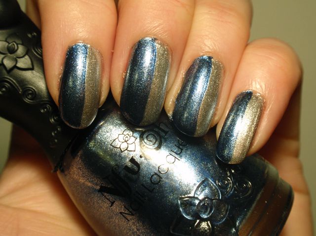 Det här är en variant på en manikyr jag gjorde på min kompis Lotta till hennes promoveringsfest (ni kan se den här). Jag började med tre lager av det silvriga Depend 106 och målade sedan halva nageln med tre lager av Nfu Oh 69. Båda lacken var ganska skira, men helt ok att jobba med. Det höll bra, när jag tog bort det efter fyra dagar var det inte särskilt slitet alls.