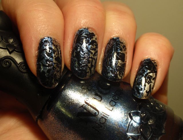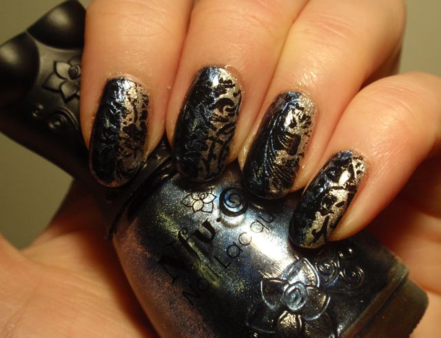 This is three coats of Depend 106 as a base with half the nail painted with three coats of Nfu Oh 61. When it was dry I added a black lace nail art foil. I was not that happy with the result, it was a little too much or something. But you can’t succeed every time, I guess…