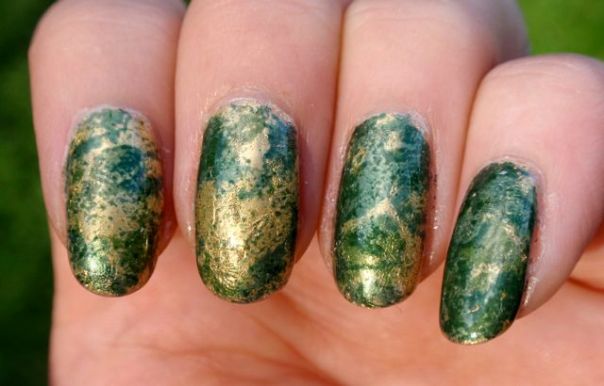 Den här folien har jag över två lager av blekguldiga Depend 118. Det var ett riktigt trevligt lack som täckte på två lager och torkade fort. Jag gillar resultatet, kanske lite extra mycket eftersom det matchar min vigsel- och förlovningsring… 🙂