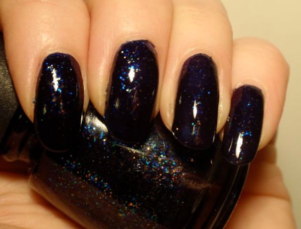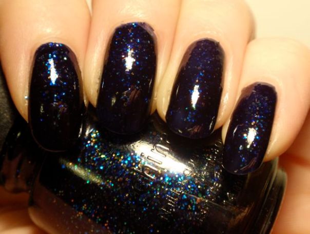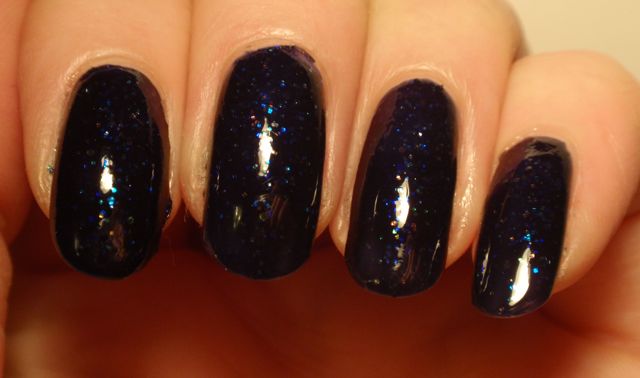 Det här lacket har jag gett bort till Honi, som skrev att hon var sugen på att skaffa det. Jag har nämligen haft det rätt länge men är inte särskilt förtjust i varken det eller Cosmic, som båda är från China Glaze’s glitterkollektion. Jag insåg däremot att jag inte har fotat Meteor Shower, så jag tog och swatchade det lite snabbt innan jag skickar iväg det (jag har inte kommit fram till att posta det än, tyvärr). Min omedelbara reaktion var att jag hade varit orättvis mot det och att det egentligen inte var så illa. Innan det har torkat är det faktiskt riktigt fint, mörkblått med glitter i olika färger. Tyvärr är det nästan som att glittret sjunker ner i lacket när det torkar och dessutom blir det väldigt knottrigt. Här har jag två lager Seche Vite, och det är ändå ordentligt ojämnt när det torkat. Nej, det här lacket kommer jag faktiskt inte att sakna… Det kan nog bli ok om man orkar ha på tillräckligt många lager överlack, men jag tycker nog inte att det är värt besväret.