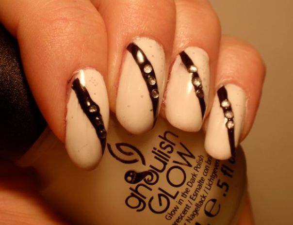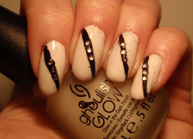 Since it’s Halloween I think I ought to show a halloweeney manicure. This is really a few weeks old, but I have not gotten around to posting it yet. It is two coats of Ghoulish Glow over three coats of Snow. The black stripe is painted by hand with a nail art polish and then I just added some rhinestones. It glows a lot more than my camera wanted to show, and is very funny to look at! It brings out the 12-year-old in me. Unfortunately the glow only shows if it is totally dark, so there are not that many times when other people can see it. But I have a lot of fun looking at my nails, so it is still worth it!