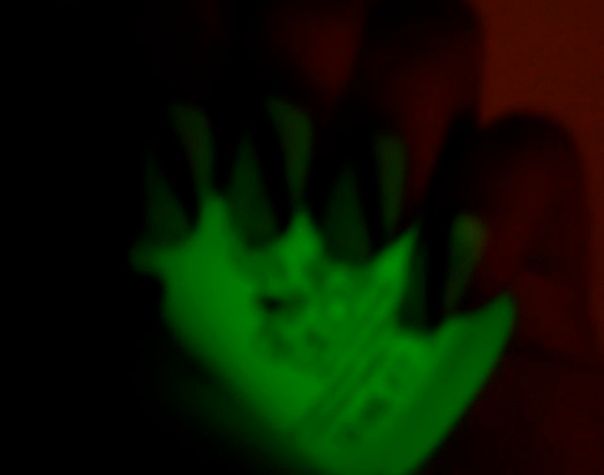 Det lyser faktiskt riktigt ordentligt, även om det inte syns så bra på bilderna. Min kamera ville inte alls ta några bilder, den tyckte inte den fick in något ljus alls. Jag tror däremot att det är en bra ide att ha det över vitt, annars syns det nog inte så värst bra. Jag testade det över ett mörkare lack på papper, och det blev mycket sämre effekt. Jag hade det över China Glaze Snow, från förra årets julkollektion. Ett helt ok vitt krämlack som jag har tre lager av på bilderna. Sedan två lager Ghoulish Glow över det.