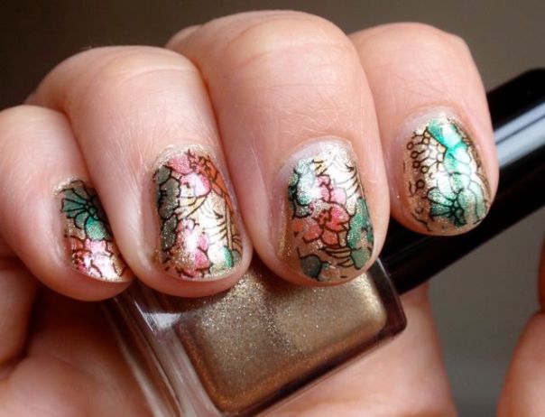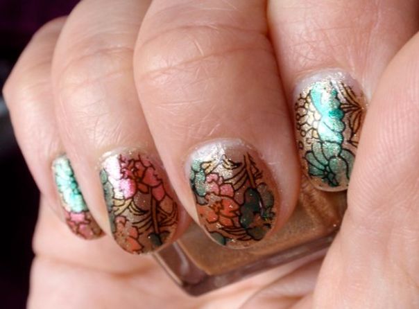 I visited my friend Lotta in Scotland again last week and of course I had to do her nails – it has become something of a tradition. She chose a transparent flowery nail art foil (from eBay) over Kicks Brownish Bazar. It is the only Kicks polish I have, and it was alright. A little sheer. This is three coats and it would have taken four if I hadn’t planned to cover it with a foil. It had a nice formula otherwise. The foil was nice and cooperative, and I quite like the end result!