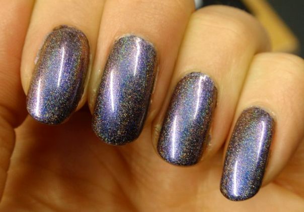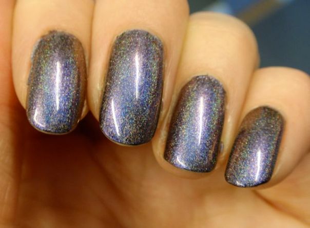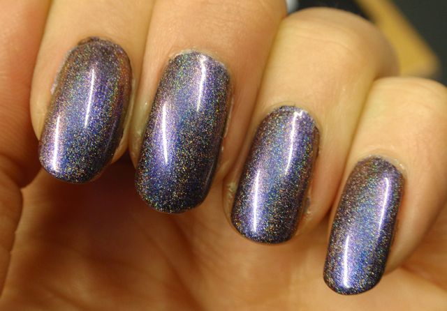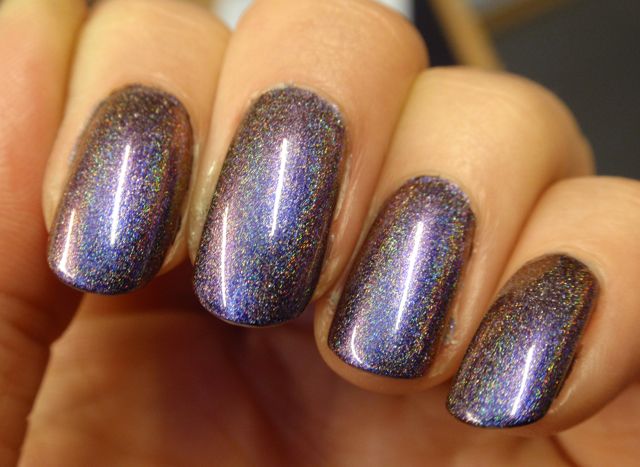 Mish Mash-lacken från Ozotic är både holografiska och multikromatiska. Det låter som en riktigt häftig ide, men jag är lite splittrad. Missförstå mig rätt, jag gillar verkligen det här lacket, men det är som att det holografiska tar över och dränker färgskiftningarna till en viss del. Jag älskar när man ser olika färger på olika delar av nageln samtidigt, men med det här är det mer så att det ser lila ut i vissa ljus och blått i andra. Fast nu ska jag sluta gnälla, det är ett härligt lack! Det skiftar ju ändå tydligt (det finns lite guld i det ibland också, för övrigt) och holoeffekten är rätt maffig! Den syns t o m i svagare ljus, vilket är tur med tanke på vädret. (Jag kommer knappt ihåg när jag senast såg solen.) Jag gillar den rätt dämpade färgen i det här lacket, det är vilsamt och elegant, men ändå piffigt eftersom det händer så mycket i det.