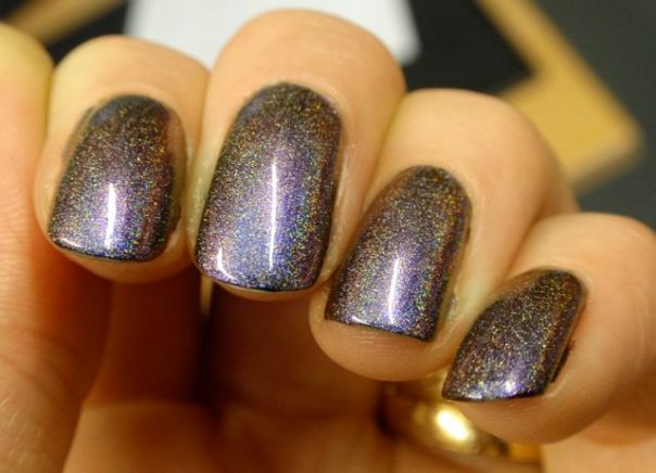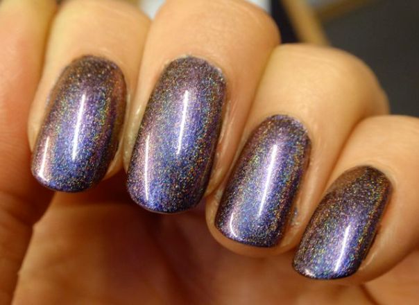 Formulan var helt ok. Jag har för mig att det torkade fortare än de multikromatiska Ozotic-lacken. Det är lätt att lacka med i alla fall. Jag har två lager över det svarta Orly Liquid Vinyl här. Picture Polish, som jag köpte det från, rekommenderar en svart bas och det blir nog mycket maffigare så. Jag vågar inte tänka på hur många lager som skulle behövas för att få det här täckande…