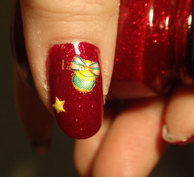 Visserligen hade jag den här manikyren för en vecka sedan, men den är så galet julig, så jag tyckte den passade bra till ett julaftonsinlägg! Det är det givna jullacket, China Glaze Ruby Pumps, med dekaler från Adnails. Ruby Pumps har ni säkert sett tiotusen gånger redan, men det är ett fint lack. Ljusare rött glitter i en medelröd bas. Tre lager på bilderna.