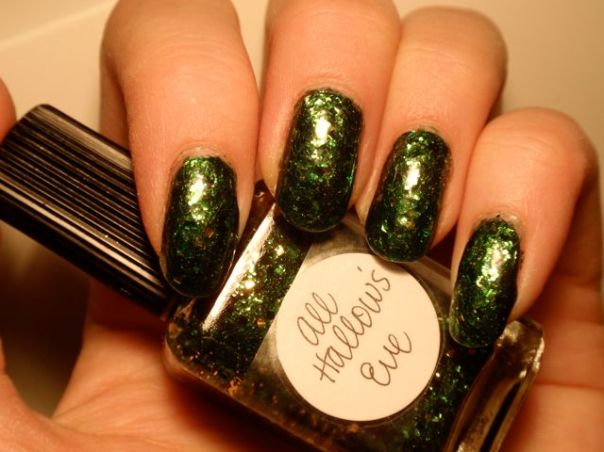 Jag jobbar mig bakåt i arkivet och har nu hamnat på det andra gröna glitterlacket jag köpt i mina Lynnderellabatcher. (Det andra är Funny Money, som jag skrivit om här.) Det kanske var lite onödigt egentligen med två snarlika lack, men det är ju så fint med gröna glitterlack… All Hallow’s Eve och Funny Money är definitivt olika också. De har ungefär samma grundfärg, men All Hallow’s Eve har svart kvadratiska ”glitter” och små guldglitter medan Funny Money har glitter i alla tänkbara färger inblandat i det gröna. Dessutom doftar Funny Money svagt av bergamottolja, vilket jag tycker är riktigt trevligt. Båda är jättefina, men jag är faktiskt lite mer förtjust i Funny Money.