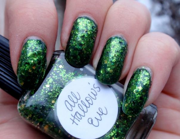 Här hade jag två lager av All Hallow’s Eve över ett lager Nubar Greener. Frågan är om inte All Hallow’s Eve skulle ha täckt på egen hand, men jag ville inte ta risken och dessutom ville jag göra det lättare att ta bort det. Lynnderellalacken är sjukt läckra, men de är en plåga att ta bort. Glitter överallt…
