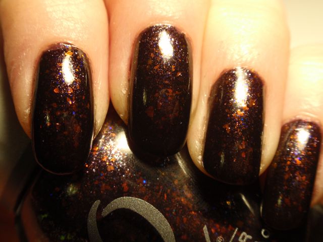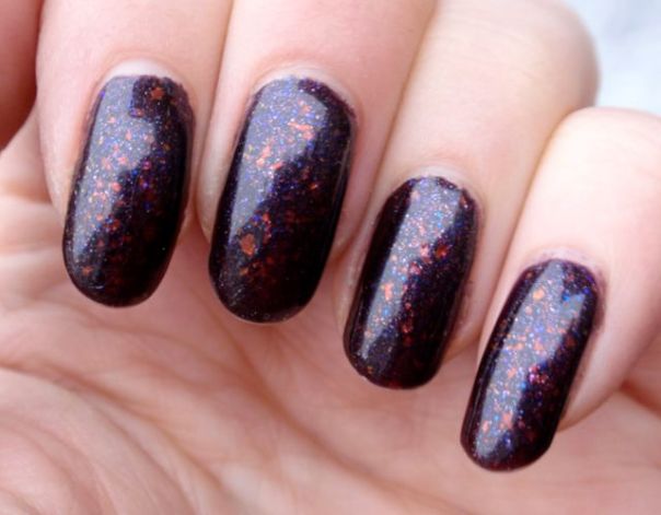 Nåja, lacket jag ska visa just nu är från riktigt djupt ner i arkivet, jag hade det väl någon gång i höstas. Orly Fowl Play är ett mörkt lila lack med ljusare rödlila flakglitter och blått smått glitter. Det är fint, men lite för mörkt för att flakglittret ska synas ordentligt. Jag har för mig att formulan var helt ok. Hm. Jag har nog faktiskt inte så mycket mer att säga om det…