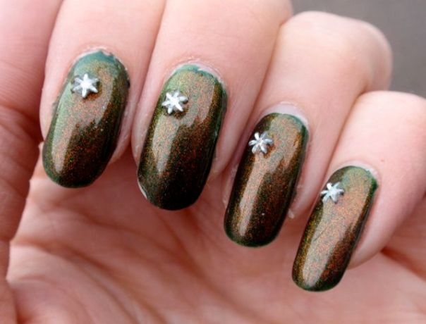 Eftersom lacket var så snyggt i sig själv och jag dessutom ville ha lite halvdiskreta naglar med anledning av examensceremonin så blev det en väldigt enkel dekor, bara några strasstenar nertryckta i lacket. Dessa är från Nailsupplies och beskrivs som snöflingeformade. Själv tycker jag mest de ser ut som klassiska stjärnor, jag, men de är i alla fall fina. Jag har insett att det verkligen är skillnad på billig strass från eBay och dyrare strass från t ex Nailsupplies. Det är helt enkelt bättre kvalitet på den dyrare (kanske inte så förvånande). De är i bättre skick (bland de billigare är många trasiga när man får dem) och gnistrar finare. Så det är faktiskt inte riktigt värt det att snåla i det här fallet, i alla fall inte om man inte vill åt mängdeffekten.