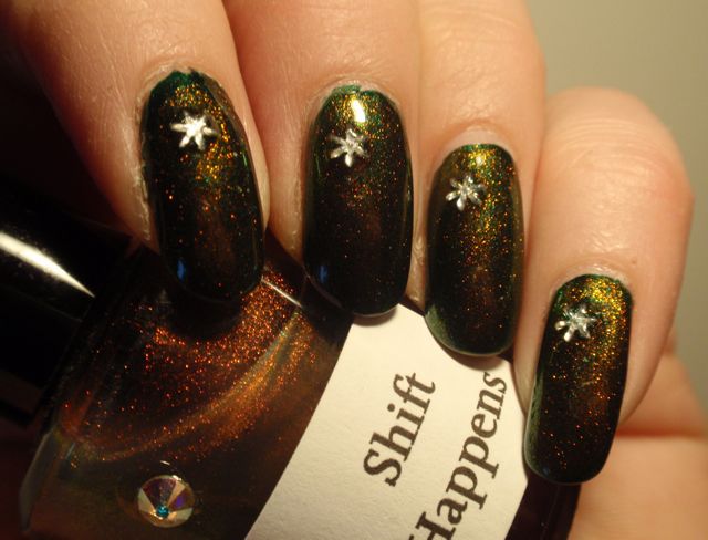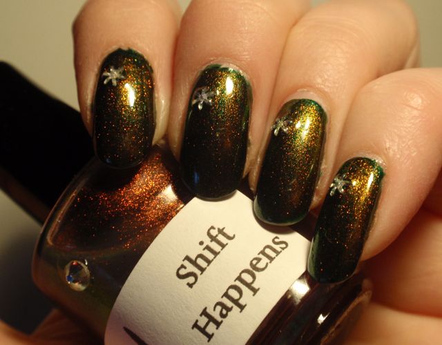 Tja, nu kanske jag inte bara ska beklaga mig. Förutom misslyckadet med mitt s.k. Nubar Greener, som jag hade som bas till den här manikyren, hade jag ett sjukt snyggt lack över, nämligen Girly Bits Shift Happens. Det är ett väldigt fint multikromatiskt effektlack som skiftar i grönt, guld och rött. Och kanske lite fler färger. Det händer saker i det hela tiden i alla fall. Tyvärr var det för mulet och jag hade för bråttom hela tiden när jag hade det för att jag skulle få till några riktigt bra bilder. Det är snyggare än det ser ut! Shift Happens hade dessutom en trevlig formula. Undrar om jag inte ska prova det över svart någon gång också bara för att få fram så många färgskiftningar som möjligt. De gröna skiftningarna syntes inte så tydligt den här gången eftersom jag hade det över ett grönt lack.