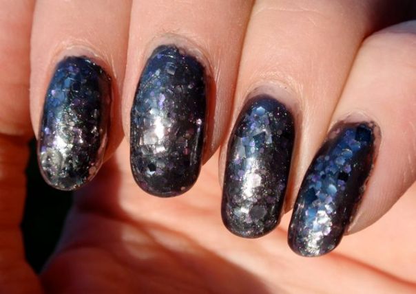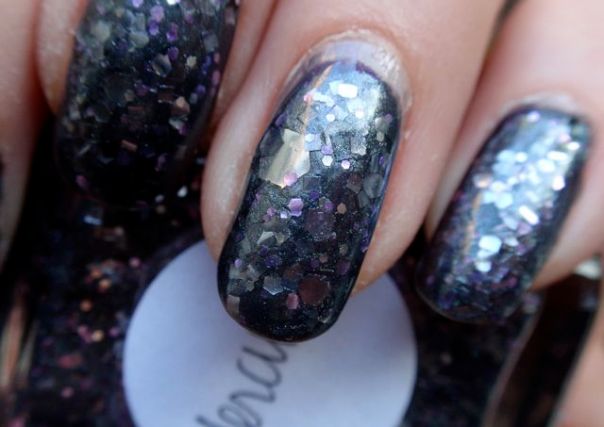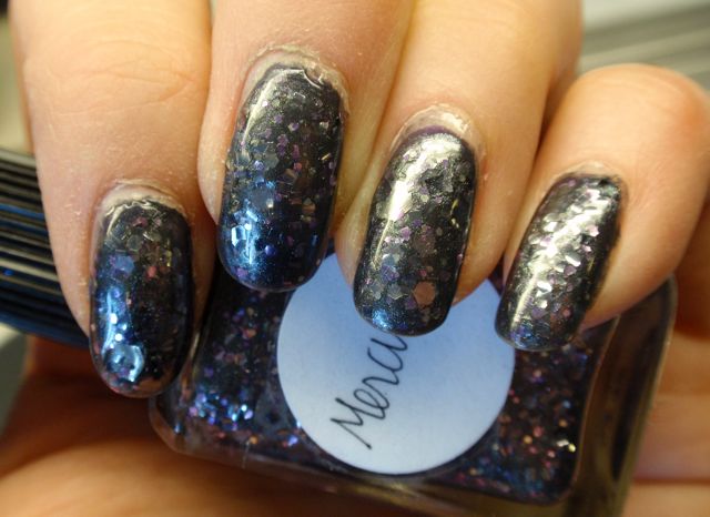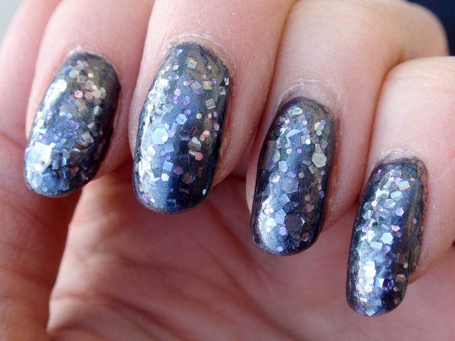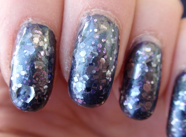 Formulan är förstås knölig eftersom det är så knökfullt med glitter. Att det har enorma hexagonala glitter i sig gör det inte direkt lättare heller, eftersom de krullar ihop sig och är nästan omöjliga att få att ligga platt. En del av dessa lyckades jag vända så de låg med den kupade sidan neråt, och då funkade det hyggligt, men de som krullade sig uppåt var hopplösa att få att inte sticka upp. Trots två-tre lager överlack (tror jag började med ett lager ej snabbtorkande och sedan drog på två lager Seche Vite) så var det inte helt jämnt. Jag hade ett lager Mercurial, men det blev rätt tjockt eftersom jag snarare duttade dit det än målade med det. Trots knögglet gillade jag det här lacket en hel del. Det är en riktigt fin, unik glitterblandning, fast det hade onekligen varit lättare att handskas med den om Lynn hade låtit bli att slänga i de enorma hexglittren…