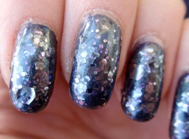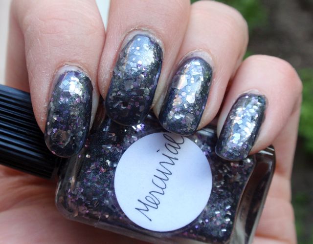 Jag håller på att sakta testa mig igenom den enorma Lynnderellabatchen jag fick hem för ett tag sedan, och nu har turen kommit till Mercurial. Det är ett riktigt fint glitterlack som huvudsakligen består av glitter i silver och ljust lila. Basen är skirt grå, men har också fint skimmer i grönt, liknande det som finns i Connect the Dots. Det skulle nog behövas rätt många lager för att det skulle täcka på egen hand så jag har det över två lager Jessica Venus Was Her Name, ett mycket fint grått lack med lilarosa skimmer i. Jag hade tänkt att det skulle matcha det lila glittret i Mercurial bra, men basen i Mercurial är lite för opak, så det syntes inte. Det gör inte så mycket dock, det blev fint ändå! Det här är ett sånt där lack som lyckas vara både rätt diskret och blingigt på samma gång.