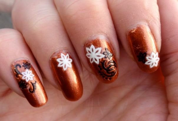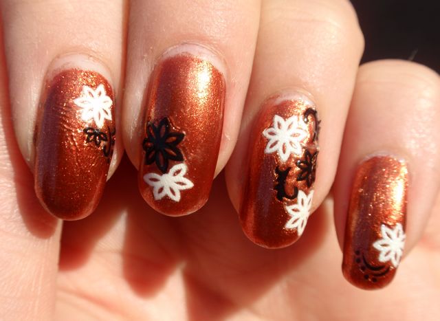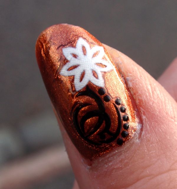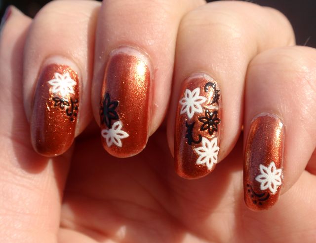 Chocolate Martini är en kopprig bruntonad orange. Inte en färg jag köper så ofta eftersom jag har fått för mig att den inte klär mig, men jag får nog tänka om. Jag gillade verkligen den här färgen. Den var inte så himla kul att lacka med, däremot. Den var lite rinnig – i o f s kontrollerbar, men eftersom lacket också krympte och liksom skrynklade ihop sig så var jag inte dödsförtjust i det. Det kan ha varit lite mitt fel också eftersom jag var lite för snabb på med dekalerna, men ändå. Orly brukar ha bättre formula än så. Jag behövde tre lager av lacket för att det skulle vara täckande.