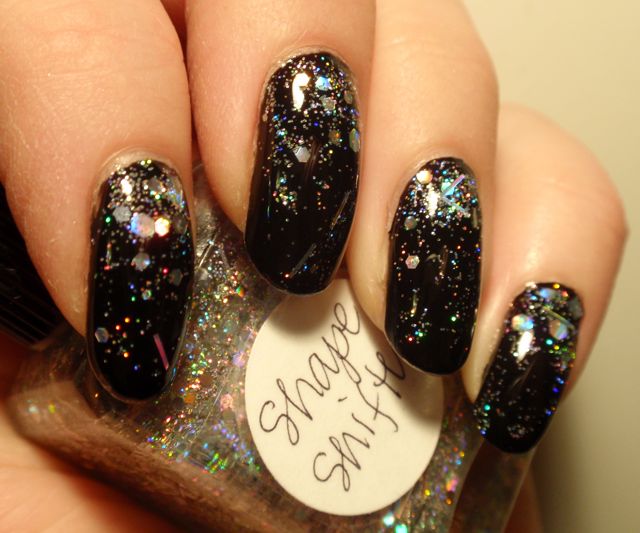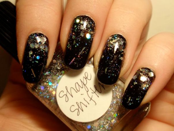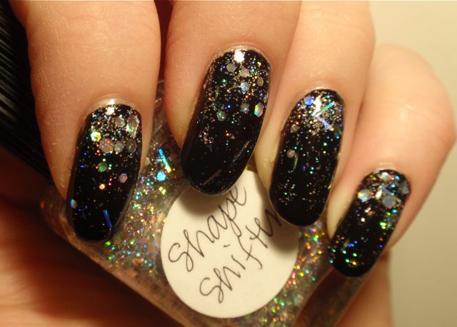 Eftersom Lynnderella har börjat sälja sina lack asdyrt på eBay så kommer jag inte köpa några fler, men jag har faktiskt ett par som jag inte har testat kvar. De är så dryga att ta bort att jag har dragit mig för att använda dem trots att de är rätt läckra. Shape Shifter har potential att bli en helt bisarr glitterbomb och jag var faktiskt inte på humör för discokulenaglar när jag testade det här, så det blev en glittergradient över svarta A-England Camelot. Jag måste säga att jag verkligen gillar den här varianten. Det blir glittrigt men ändå lite mer stilrent. (Dessutom trivs jag alltid i svarta naglar.) Shape Shifter består av prismatiska silverglitter i alla tänkbara former i en klar bas. Det är rätt tjockt och skulle nog knappast vara särskilt roligt att försöka få opakt på egen hand. Det skulle nog krävas rätt mycket överlack för att få det hyggligt slätt också. Även när jag bara hade en gradient som här behövdes två lager Seche Vite för att få det slätt.