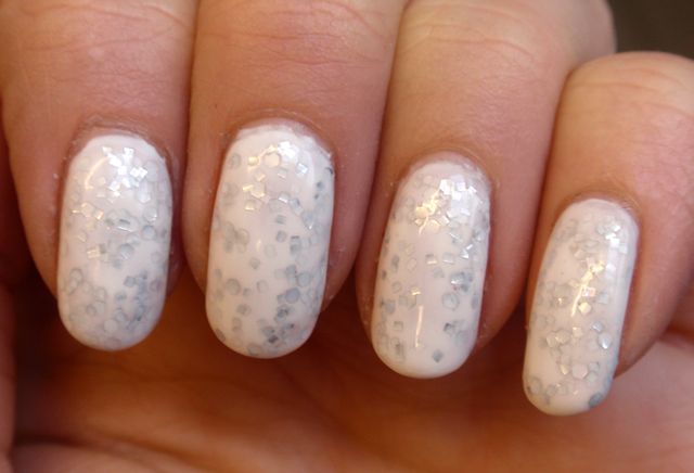 Peaceful Opposition consists of square and hex silver glitters in a milky white base. I wore it over two coats of China Glaze Snow. Getting the glitters evenly distributed on the nails was a little tricky, but it was at least quite smooth and it only took two coats of Seche Vite to get a nice, even surface.