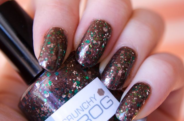 Så! Nu är vi alla på samma sida. Då måste man beundra kompositionen av lacket. Den chokladbruna grundfärgen står förstås för chokladen, det gröna glittret (i olika storlekar, och både smaragdgrönt och chartreuse) för grodan (”lightly killed”) och det silvervita glittret för grodans ben (”If we took the bones out, it wouldn’t be crunchy, would it?”). Ahhh, helt genialiskt! En av mina favoritsketcher någonsin, faktiskt. 😀 Och lacket är också otroligt fint! Mycket udda, men det funkar. På håll ser det rätt diskret ut, men när man tittar efter är det inte ett dugg diskret.