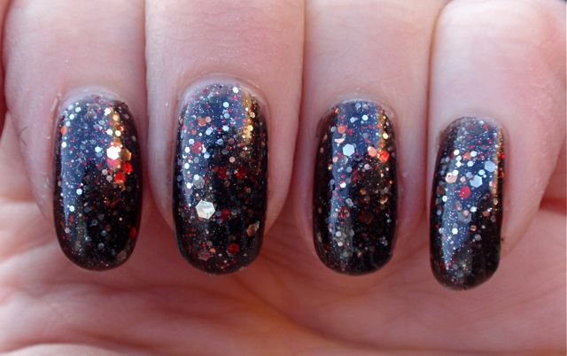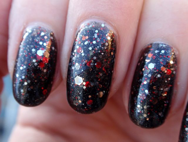 The polish is described like this on  Nerdlacquer’s web site: ”IT’S JUST A FLESH WOUND is a semi-sheer black packed with silver, red, copper, rust and black glitter. Relentlessly sparkly. Always triumphs. Will not, however, make you impervious to broadswords.” I really like how the glitters aren’t swallowed by the black base, even though it is opaque enough to cover in three coats. That is rare in a black glitter!