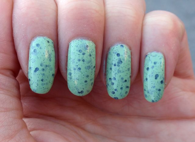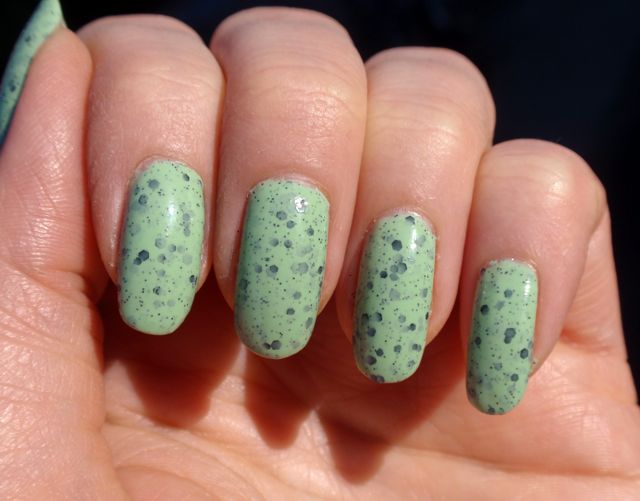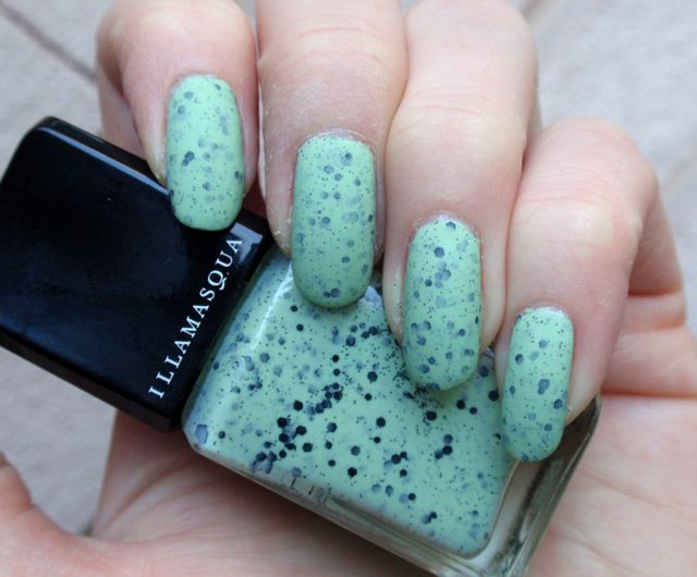 Illamasqua Mottle is a nice light green (mint?) polish with tiny and medium sized black glitters. I really like it and it reminds me of candy eggs. I think my bottle has dried some since I got it, because it was a bit thick, which Freckle wasn’t.