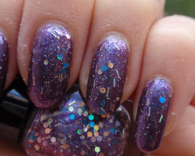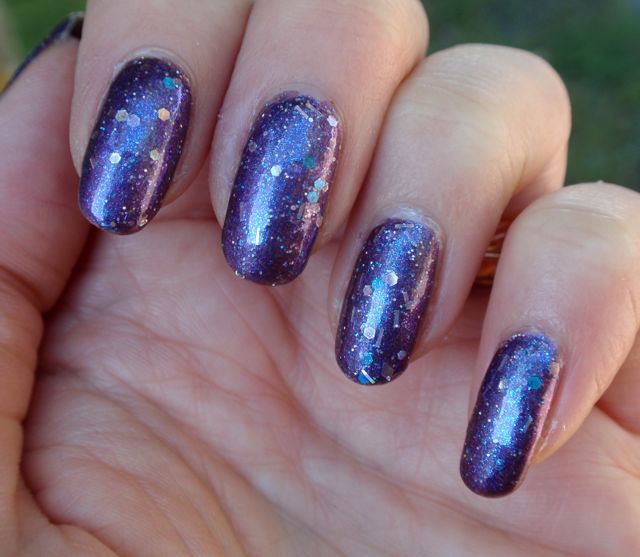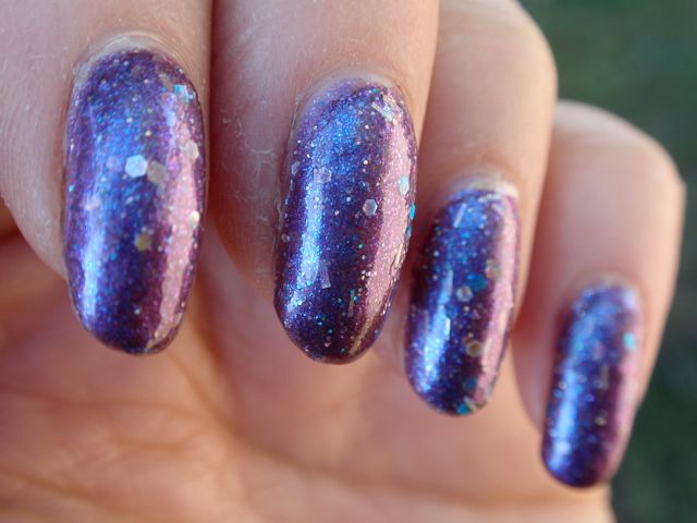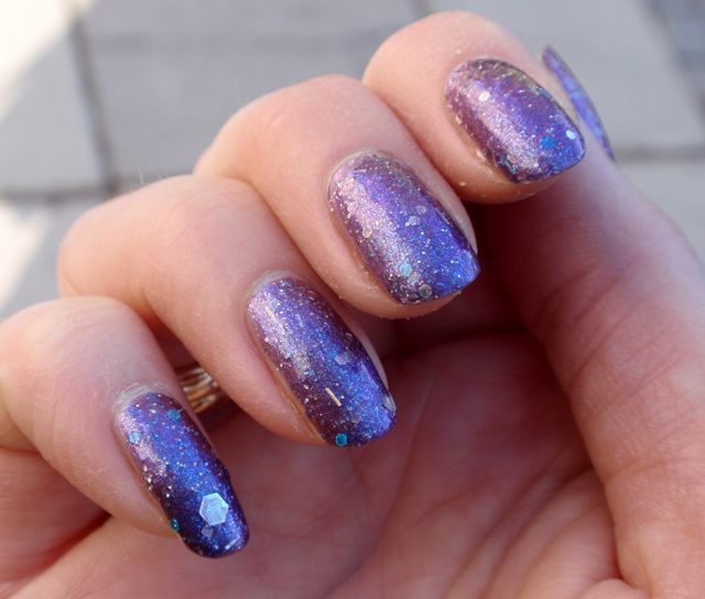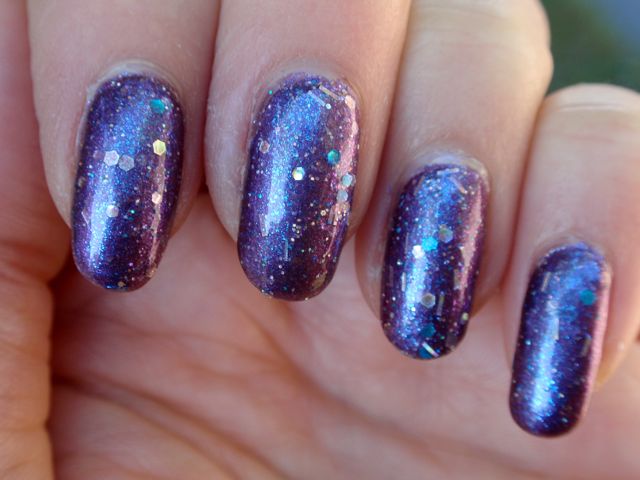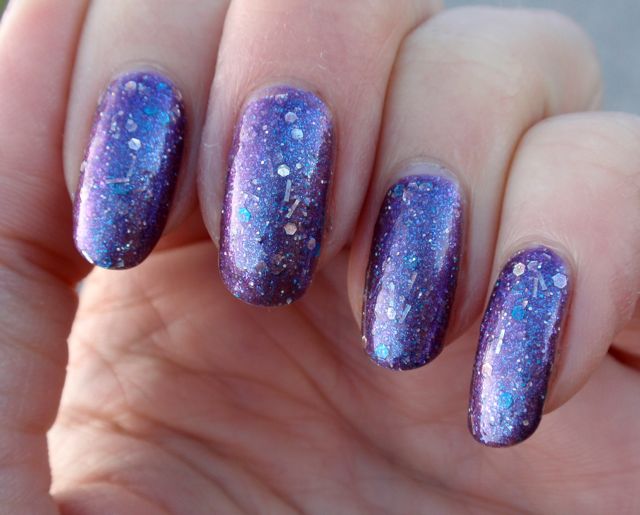 This is the ninth polish I have mixed up on my own so far – there are more produced all the time right now! For this one I used a purple pigment, a duochrome pigment shifting between blue and purple and two prismatic glitter mixes, one blue and one silver. I really like the end result and am quite fond of this one!