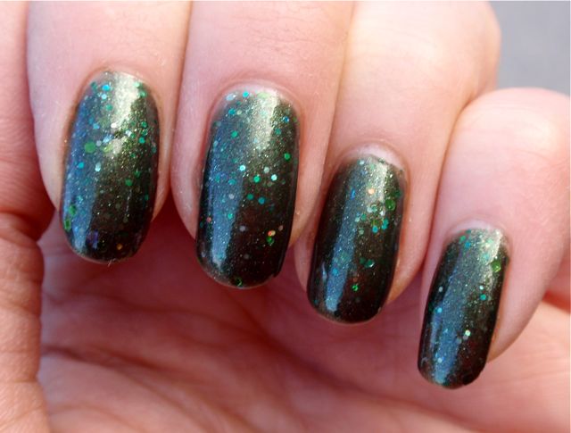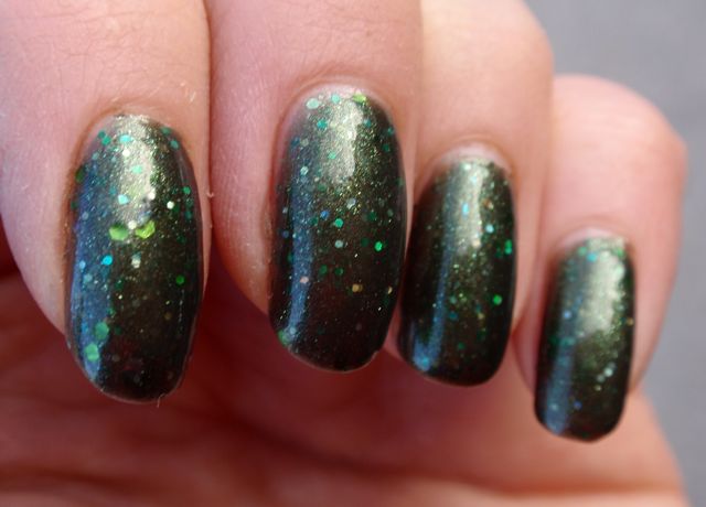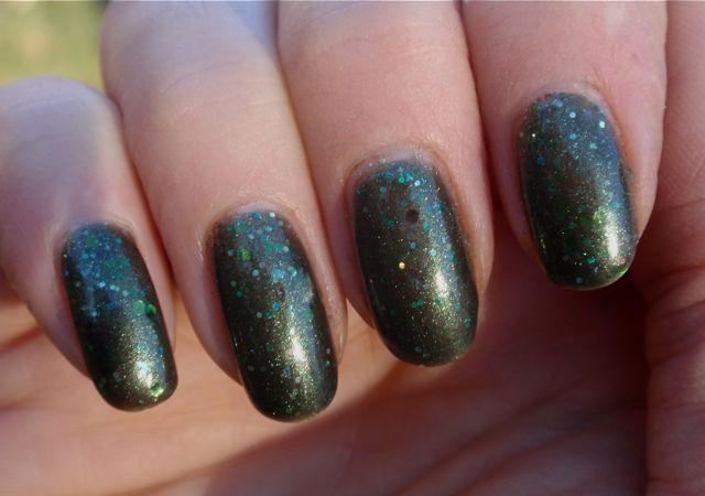 Lacket är i o f s vackert också, så jag hade kanske skaffat det oavsett namnet. Det består av en skirt mörkgrön bas med prismatiska glitter i olika nyanser av grönt (och kanske blått?) och svarta glitter. Glittren är inte jättetäta och det påminner lite i karaktären av Nerdlaquers lack. Det här krävde dock fyra lager för att täcka, men då hade det å andra sidan ett väldigt fint jellyaktigt djup. Jag gillade det!