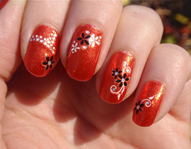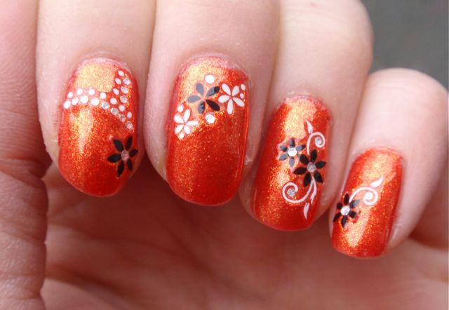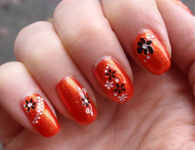 Det här är något så ovanligt som ett orange lack som faktiskt är täckande efter två lager. Jag hade tre, men det var mest av allmän nojighet. Trevligt att lacka med var det också, så Zoya håller som vanligt en hög kvalitet. Det är en härligt lysande orange som skimrar i gult, som ni ser. Kanske inte ett traditionellt höstlack, men när det är så här mörkt ute behöver jag lite färg på naglarna för att pigga upp mig! Tyvärr kommer jag inte ihåg var jag köpte dekalerna, men de var rätt fina. Inte superunika direkt, däremot.
