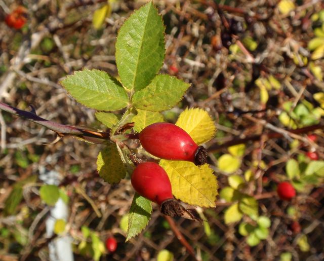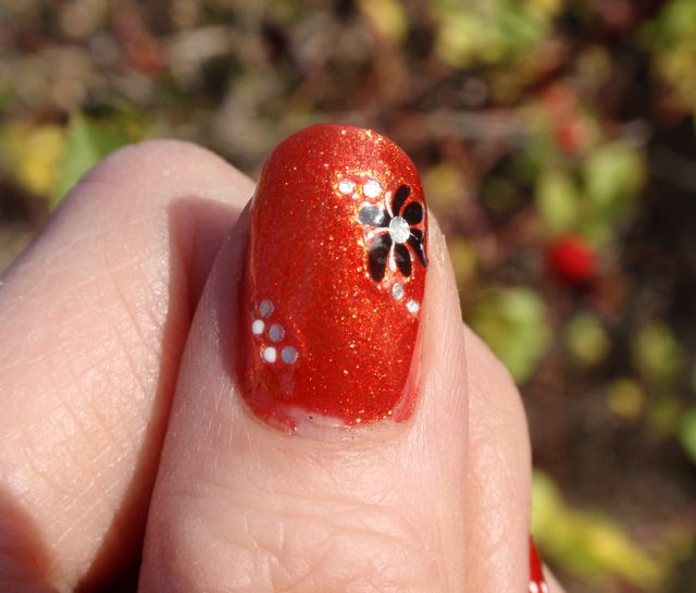 På vägen till jobbet häromdagen så passerade jag en i stort sett avlövad nyponbuske som låg precis i en strimma, så jag hoppade av cykeln och passade på att få lite höstiga nagellackskort.