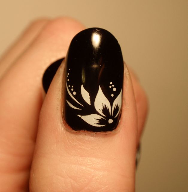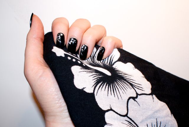 Veckans tema för Nail Art Sunday är ”resa”, och det första jag kom att tänka på var min och makens fantastiska bröllopsresa till Costa Rica. Vi reste från Atlantkusten till Stilla Havskusten och hann se massor av underbar natur på vägen. Resan avslutades med ett par dagars vistelse i Playa Samara på Stilla Havskusten. Det är ett klassiskt, avslappnat surfarställe – inte egentligen ett ställe för en sån som mig som inte gillar för mycket sol och bad. (Jag är en typisk blekfis som inte solar alls, dels bränner jag mig väldigt lätt och dels är jag inte så förtjust i att ligga stilla och bli varm.) Trots det hade vi det jättetrevligt. Vi badade lite (hittade en lång sandstrand som vi hade nästan helt för oss själva), drack öl i skuggan under palmerna och satt på kvällarna och lyssnade på havet och drack goda drinkar. Hur som helst, när vi var där köpte jag en sarong i svart med vita lotusblommor på, och den fick vara inspiration för veckans manikyr. Jag köpte vattendekaler i form av vita lotusblommor på eBay för ett tag sedan, så det var inte svårt att kopiera sjalens mönster. Mycket trevliga dekaler f ö, de fäste bra och torkade snabbt och var allmänt perfekta att hålla på med. Synd att jag inte kommer ihåg varifrån jag köpte dem…