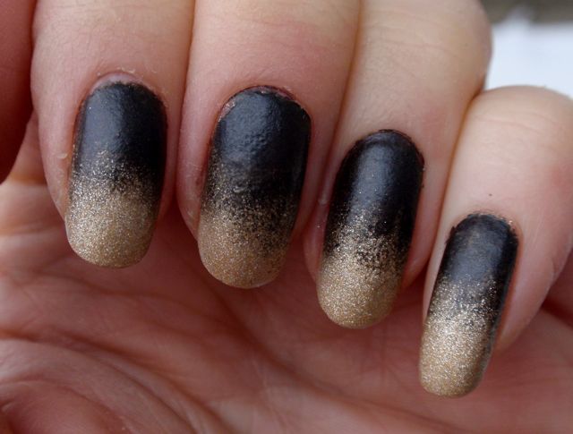 De här två lacken från Gwen Stefanikollektionen (som släpps nu i dagarna) är det många som har kombinerat i samma manikyr, vilket inte är så konstigt eftersom de har liknande finish. Dessutom är guld och svart en klassiskt snygg kombination. Jag ville variera mig lite och försökte mig på en gradient. Det är alltid lite knepigt med gradienter med kontrasterande färger, och jag tycker nog att jag hade kunnat få den lite jämnare. Det här blev lite av en mellanmanikyr. Den är ok, men jag tröttnade snabbt. Jag tror också att den hade varit snyggare blank än satinmatt. Dessutom blev det svarta lacket inte så snyggt när jag svampade med det. Det blev lite knöligt och inte sådär snyggt satinigt. Det guldiga funkade bättre. (Och så hade jag definitivt kunnat städa upp den lite bättre…)