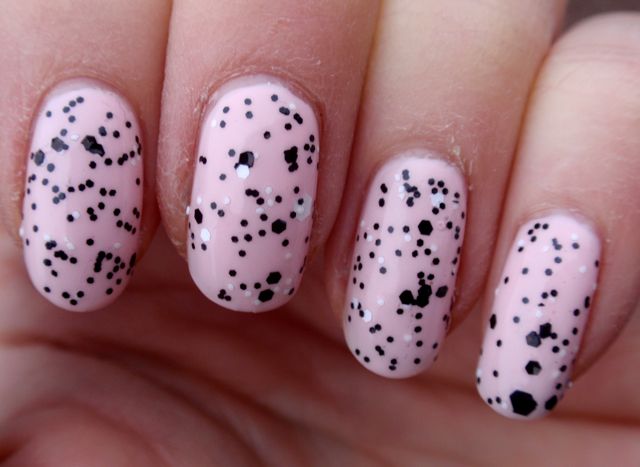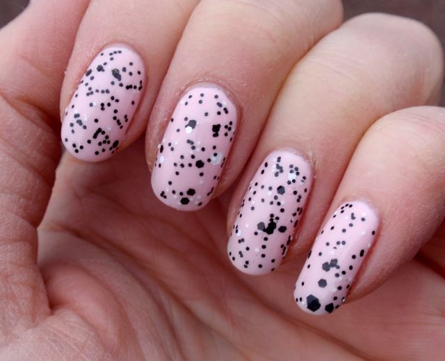 För att motverka gullighetsfaktorn lite lade jag på ett lager Dollish Polish Putting on the Ritzzz! Det består av svarta och vita glitter i en klar bas och är en av alla kopior av Lynnderella Connect the Dots. Anledningen till att jag köpte det här fast jag har Connect the Dots är att det här inte har något skimmer i sig (som Connect the Dots har), och därför blir lite striktare, vilket kan passa bättre i vissa kombinationer. Dessutom fanns det i miniflaska på Dollish Polish webshop och var alltså ganska billigt (plus att jag gillar miniflaskor eftersom jag aldrig tar slut på fullstora). Med det över det rosa blev manikyren mycket bättre, och jag tyckte att den var helt ok.