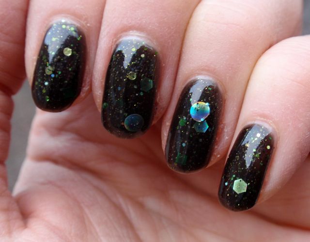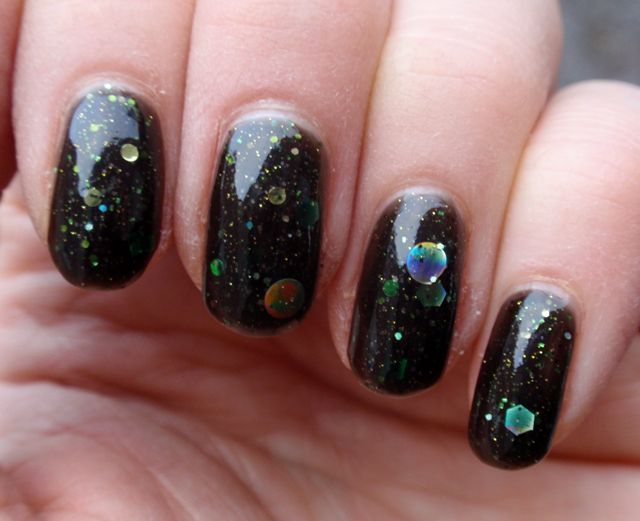 I really like this, it glitters nicely and I am very comfortable wearing this kind of dark greens. And I am fond of round glitters, that can’t be denied…