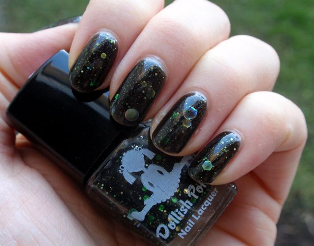 Dags för några gamla bilder på ett riktigt fint lack! Things Are Looking Very GRIMM är inspirerat av tv-serien Grimm, som råkar vara en av mina favoriter just nu. Det är ett murrigt grönbrunt lack med en skirt färgad bas med glitter i varierande former och storlekar i olika gröna nyanser, några av glittren är prismatiska, däribland de stora cirkelglittren. Det tog fyra lager att få det täckande eftersom det är så skirt, men jag tror att glittren skulle ha drunknat i basen om den var mer opak. Nu skiner de igenom och glittrar fint i murret. Jag gillar verkligen det här!