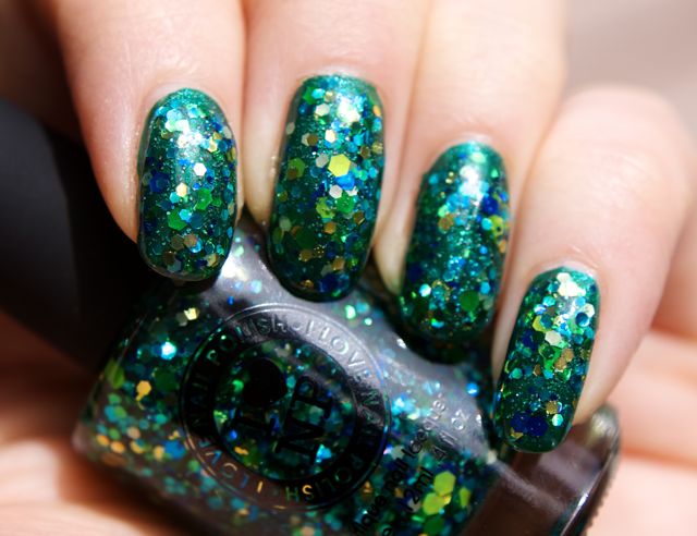 Old Gregg is a lovely green glitter bomb from ILNP, just the kind of polish can’t resist! It consists of medium sized glitters in various nuances of green, blue and gold, and small black glitters in a very sheer green base. I wore two coats over the blue-green shimmer Nubar Conserve (which is a lovely polish).