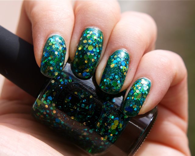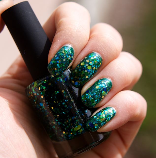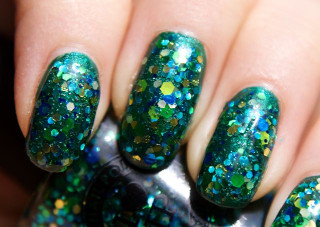 Om neonmanikyren jag visade senast var atypisk för mig så är det här mycket mer en klassisk nageldrakemanikyr. Jag är ju en sucker för grönt glitter, så jag kunde inte motstå den här glitterbomben från ILNP! Old Gregg består av mellanstora glitter i olika nyanser av grönt, blått och guld samt små svarta glitter i en mycket svagt gröntonad bas. Det är gott om glitter och det fördelar sig ganska jämnt på nageln. Jag hade två lager och då var det inte täckande men i alla fall jämnt utspritt över hela nageln. Det går nog att få det täckande på egen hand, men jag ville inte riskera att behöva göra för många lager glitter (det är så drygt att ta bort), så jag grundade med ett lager av den gamla godingen Nuber Conserve från Nubars gröna kollektion Going Green som kom 2009. Den kollektionen gjorde mig verkligen lycklig när den kom eftersom jag fram tills dess hade varit svältfödd på gröna lack! Den innehöll riktigt fina lack med Nubars underbara formula. Jag blev påmind om det när jag lackade med Conserve nu. Det är lagom tunt och fint och hamnar precis där man vill ha det! Det var rätt roligt att ramla på Scrangies kollektionspost när jag googlade efter vilket år Going Green släpptes. En påminnelse om en annan tid då det var mycket svårare att få tag på roliga nagellack.